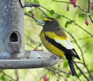 Evening Grosbeak – Evening grosbeaks are usually seen flying overhead, perched in treetops, or at bird feeders. They do not mix with other species in winter. They are large and short-tailed with massive heads and beaks. Males have bright yellow over their eyes, back, and bellies and white secondary flight feathers. Females are more olive gray in color. Look for them around the Russian olives in the park. Evening grosbeaks do not breed in this area, but they can winter here.
